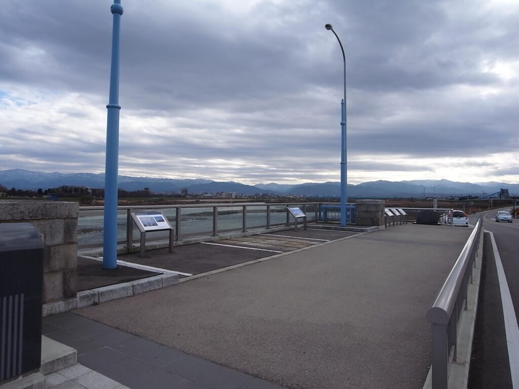 また、本橋の橋詰にあたる両岸の旧橋原位置には、橋梁端部を復元したポケットパークが整備されました。ポケットパークには、旧橋の親柱、橋名板、路面電車の軌道、照明柱兼架線柱が設置され、富山県の発展とともに歩み、広く県民に親しまれてきた旧橋について、現在に伝える役割を担っています。